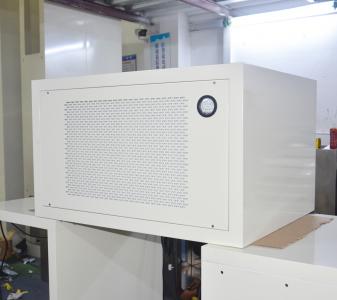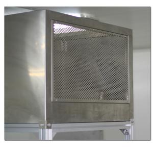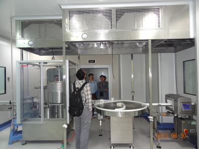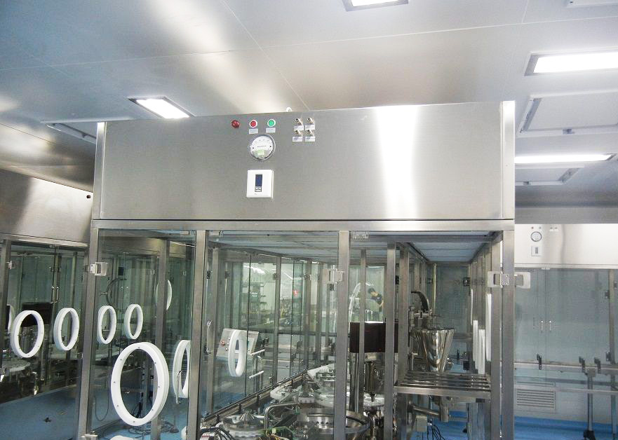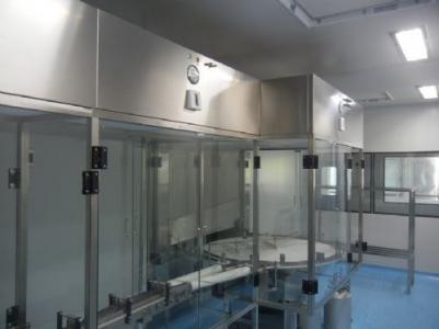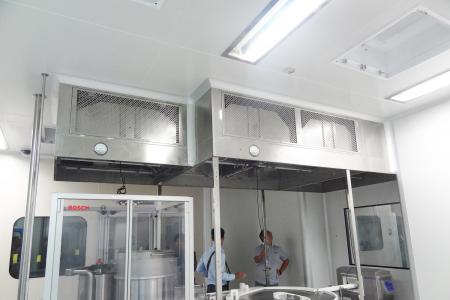 整體采用SUS304不銹鋼材料制作,利用大功率風(fēng)機或中央空調(diào)系統(tǒng)進行送回風(fēng),溫濕度控制較為方便。過濾器采用液槽密封形式,確保無泄漏。層流罩氣流為垂直單向流,出風(fēng)面可加裝均流膜,風(fēng)速在0.36-0.55m/s,可通過煙霧測試證明單向流狀態(tài)。層流罩上安裝PAO發(fā)塵口,PAO上游采樣口,可對每臺過濾器進行現(xiàn)場檢測。層流罩隔離裝置采用防靜電PC板或防靜電軟簾。